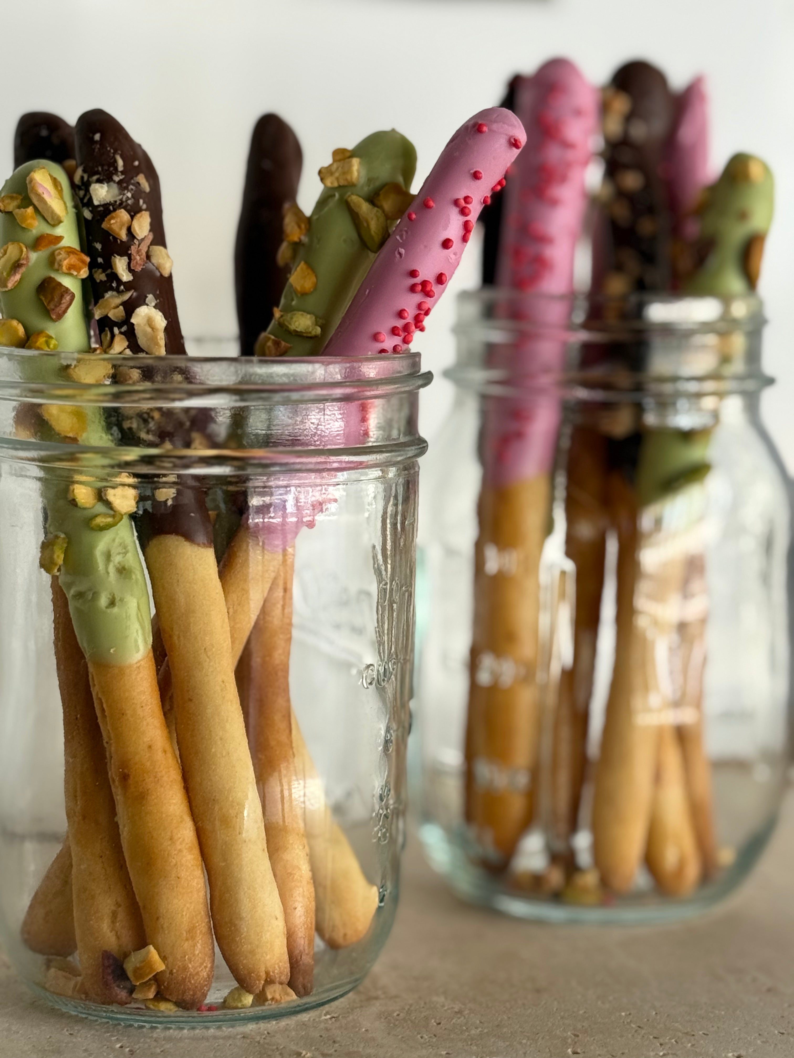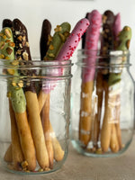 (Biscuit sticks coated in a smooth layer of chocolate, strawberry and pistachio flavoured coating. Sprinkled with nuts and candy on top)